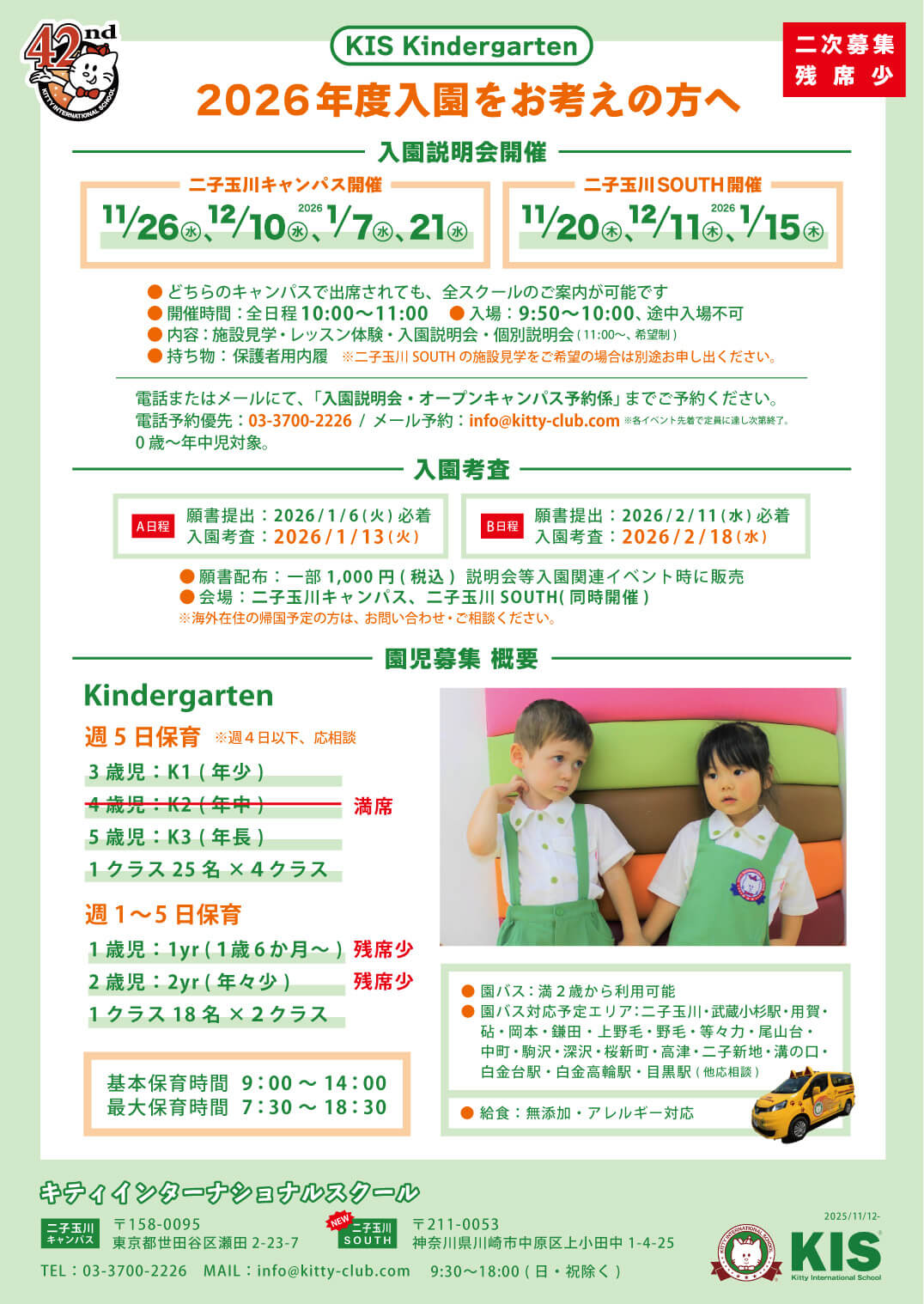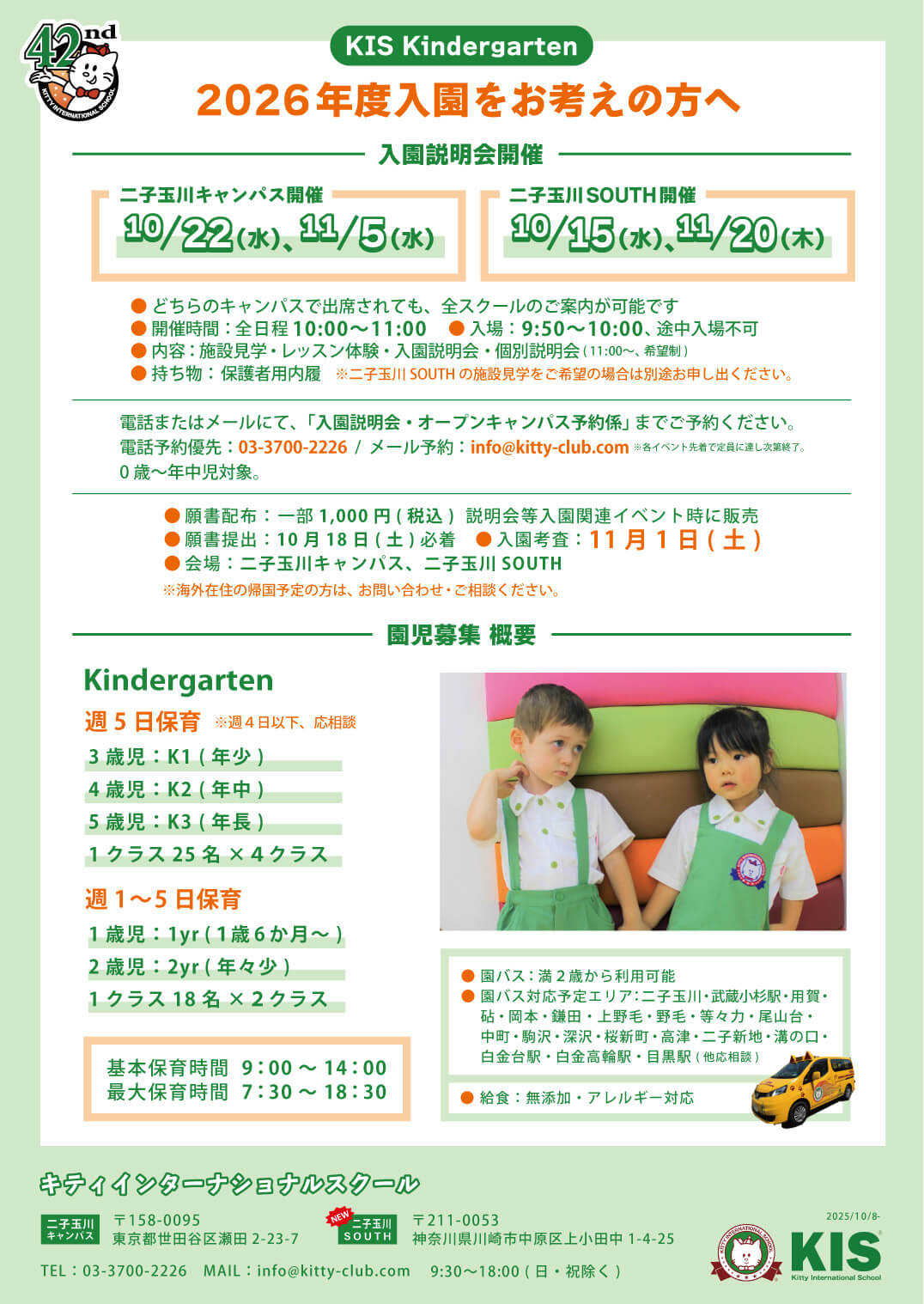 オープンキャンパスの日程にお越しいただいた場合にも、入園説明をご希望の場合にはご案内可能です(予約制)。東京都世田谷区の二子玉川や成城エリアで、英語の幼稚園・保育園をお探しの方に向けて、説明会を実施いたします。 例年、玉川・用賀・上野毛・桜新町および、成城等から多くの生徒さんにお越しいただいております。新規開園の二子玉川SOUTHでは、地元の武蔵新城周辺の皆様や武蔵小杉・溝の口、高津のエリアから通学可能です。