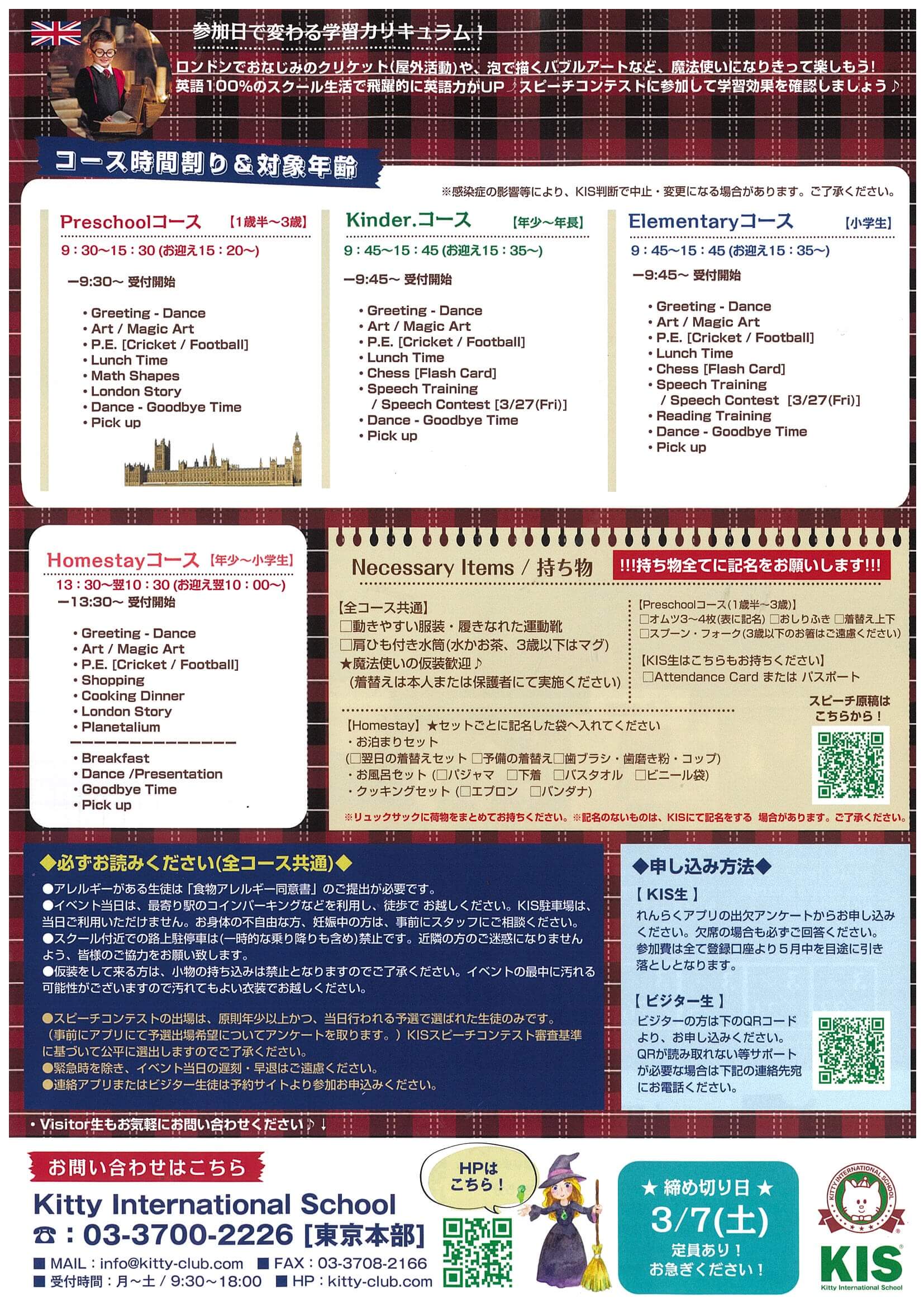対象:Preschool コース(1歳半~3歳)、Kinder.コース(年少~年長)、Elementary コース(小学生)、Homestay コース(年少~小学生)