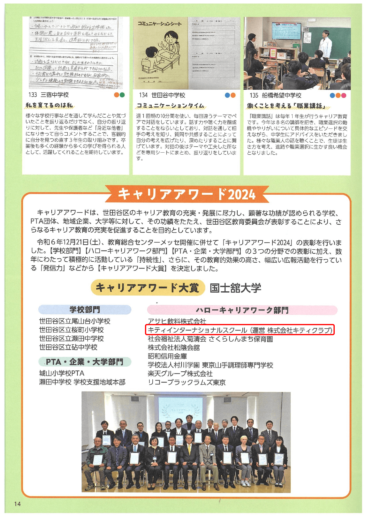 世田谷区のキャリア教育の充実・発展に貢献している団体に対して与えられる、「せたがやキャリアアワード」という賞を、キティインターナショナルスクールが2024年度に受賞しました。